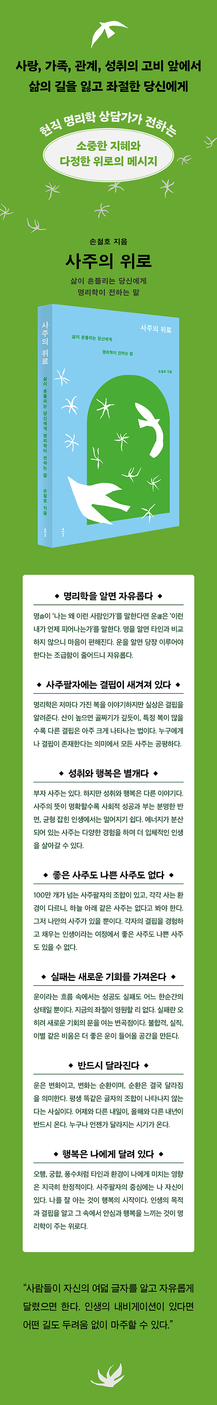 물 가운데, 불이 빛나는 등대 사주인데, 그래서 그런지 지금까지 경험한 모든 일은 사람들에게 방향을 제시하는 등대와 같은 역할이었다. 모든 사주팔자에는 결핍이 각인되어 있다. 그 결핍을 겪어야 하는 시간이 반드시 온다. 이 책 《사주의 위로》는 사랑, 가족, 직장, 명예, 재물, 그 어떤 것의 결핍 때문에 깊은 어둠 속을 헤매고 있는 사람들에게 지금 이 순간의 의미가 무엇인지, 그래서 어느 방향으로 나아가야 하는지를 알려주는 조그만 불빛을 비춰주는 것이 목적이다.