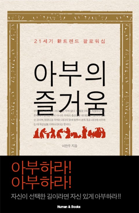 대한민국은 이제 누가 뭐래도 ‘조직’에 바탕을 둔 사회다. 학교, 군대, 각급 단체, 회사 등 이런저런 조직을 거치지 않고 일생을 마친다는 것 자체가 불가능하다. 조직사회에는 반드시 권력관계가 있게 마련이다. 권력관계가 있으면 당연히 지배와 종속이 뒤따른다. 조직 구성원 전체가 리더가 될 수는 없다. 이 책에서는 조직을 구성하는 대부분의 조직원에게 필요한 팔로워십에 관한 정의를 내리고자 한다. 그렇다고 ‘아부’에 관해 좋은 것만 밝히려는 것은 아니다. 인간 삶의 대표적인 표현 양식 가운데 하나인 ‘아부’에 대해 직시해보자는 것이 이 책의 핵심 동기다. 우리는 흔히 지도자의 길, 즉 리더십에 대해 많은 이야기를 한다. 반면에 부하의 길, 팔로워십에 대한 고민은 등한시한다. 조직은 리더만의 것이 아니다. 이 책에서 고찰하고자 하는 ‘아부’는 조직의 존속을 위한 팔로워십의 또 다른 이름이다.