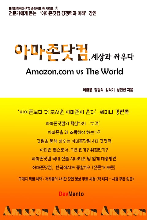 그 아마존닷컴이 한국에 들어온다면 어떤 일이 벌어질까? 이 책의 기획 배경이 된 이유다. 데브멘토는 모비애드와 공동으로 2013년 8월 ‘아이폰보다 더 무서운 아마존이 온다’라는 주제로 세미나를 개최했다. 평소 아마존닷컴에 대해 관심이 많거나 직접 경험을 하고, 보고서도 냈던 업계 전문가 4명(이금룡, 김형석, 김석기, 성민현)의 강연을 진행했다.