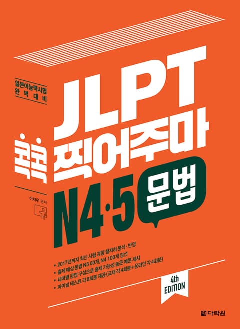 『JLPT 콕콕 찍어주마 시리즈』는 2003년 첫 출간 이후, JLPT 대표 분야별 대비서로 자리를 잡고 있는 시리즈입니다.『(4th EDITION) JLPT 콕콕 찍어주마 N4?5 문법』은 2010년에 출간된『新일본어 능력시험 문법 콕콕 찍어주마 ?N4?5 대비-』의 최신 개정판으로, 2010년~2017년까지의 최신 시험 경향을 철저히 분석하여 반영한 N4?5 문법 완벽 대비판입니다.