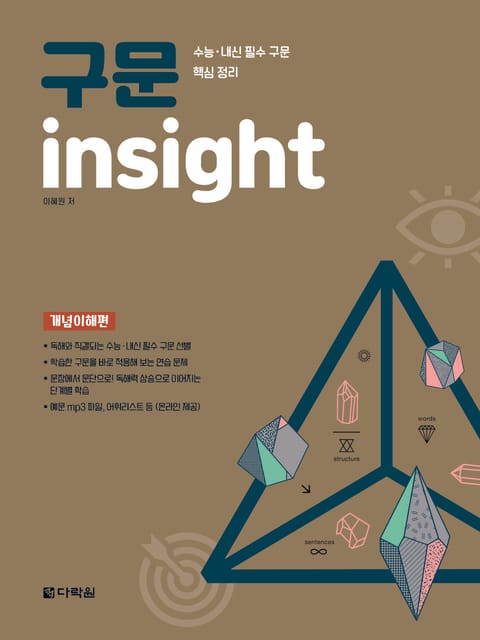 수능∙내신 대비 필수 개념 기본서인 ‘insight’ 시리즈에서 새로 선보이는 본 교재는 ‘구문 insight 개념이해편’, ‘구문 insight 독해‧영작 응용편’ 두 권으로 이루어져 있으며 ‘개념이해편’으로 수능‧내신 필수 구문에 대한 전반적인 학습 및 훈련을 하고, ‘독해‧영작 응용편’으로 수능형 지문에 제시된 구문을 문맥을 통해 집중적으로 훈련하며 실전에 효율적으로 대비하도록 했습니다.