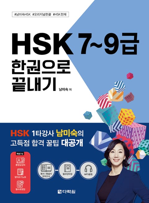 『HSK 7~9급 한권으로 끝내기』는 1타 강사 남미숙의 21년 강의 노하우와 <남미숙 중국어연구소>의 철저한 분석을 바탕으로 시험 합격을 위한 최적의 내용으로 구성했습니다. 제1회 HSK 7~9급 시험에서 100% 합격생을 배출한 출제 경향 분석 역량과 21년간 축적된 데이터, 그리고 한국과 중국 베타테스트를 바탕으로 HSK를 정복할 수 있는 완벽한 솔루션을 체계화했습니다.