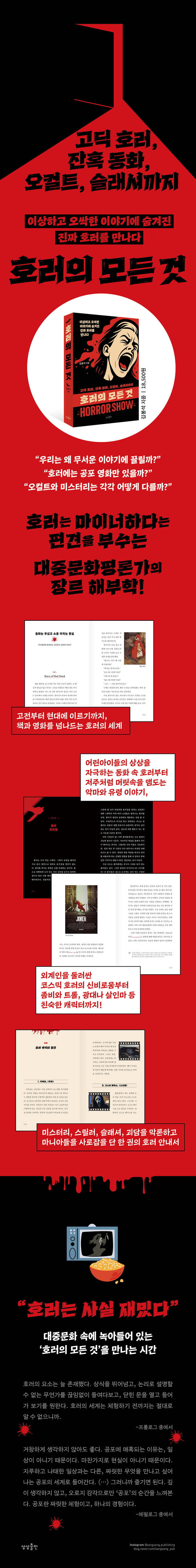 「씨네 21」, 「한겨레」 기자 및 컬처매거진 《브뤼트》, 만화 리뷰 웹진 《에이코믹스》, 인문 웹진 《360도》의 편집장을 지내고 작가와 대중문화평론가로 활발히 활동 중인 저자 김봉석의 신간, 『호러의 모든 것』이 출간되었다. 『호러의 모든 것』은 고딕 호러부터 오컬트, 미스터리, 추리, 스릴러, 슬래셔 등 모든 장르를 아우르며, ‘호러는 무섭기만 한 장르’라는 편견을 부수고 보다 깊은 인문학적인 의미를 제시해 준다.