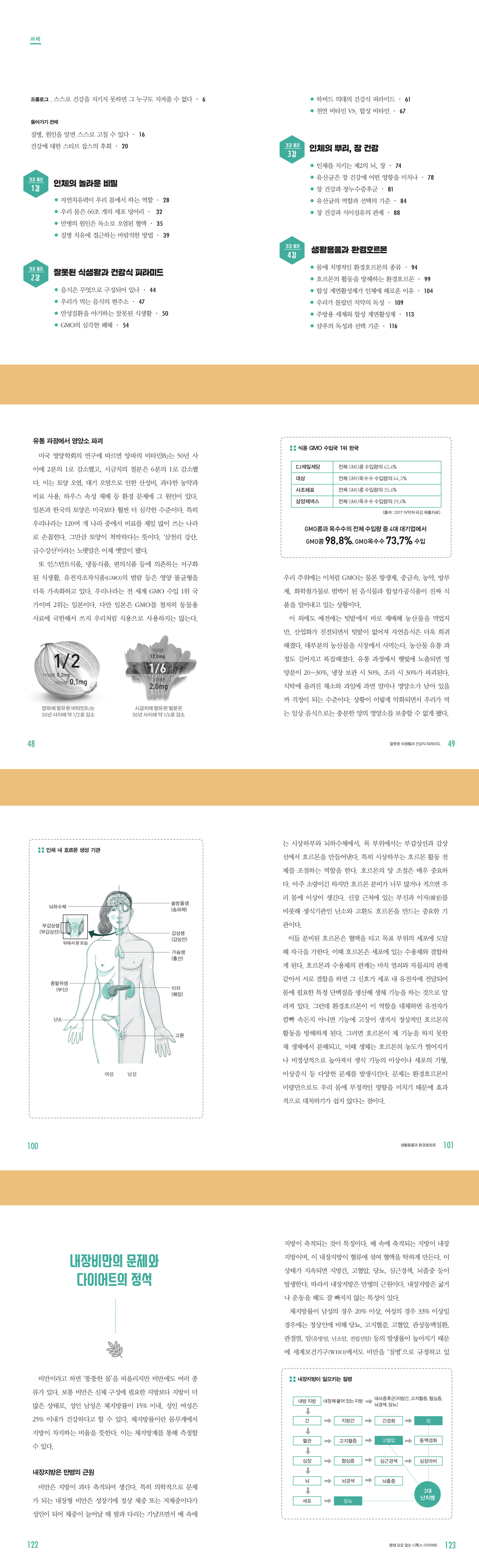 ● 1강에서는 인체와 자연치유력에 대해 전반적으로 소개를 하고 있으며 노화와 질병의 원리를 밝히고 있다. 2강에서는 ‘최고의 식단’을 위한 상세한 정보를 제공하고 있다. 3강에서는 면역력에서도 제일 중요한 장 건강을 다루고 있다. 4강에서는 피부를 통해서 우리 몸에 침투하는 경피독의 실체를 밝혀 오염된 환경에서 자신을 지키는 법을 알려주고 있다. 5강에서는 다이어터라면 누구나 꿈꾸는 요요 없는 다이어트법을 알려주고 있다. 이는 디톡스에 의한 방법이기 때문에 몸 안의 독소를 함께 없애주어 건강하고 날씬한 몸을 만드는 데에 도움이 된다.