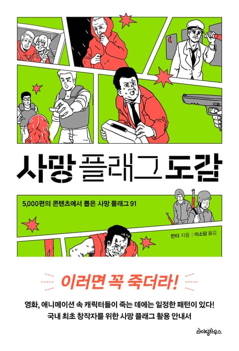 《사망 플래그 도감》은 캐릭터의 죽음을 예고하는 서사적 장치인 ‘사망 플래그’를 통해 영화, 드라마, 애니메이션 속 등장인물이 죽는 전형적인 패턴을 91가지로 정리한 책이다. 일본의 일러스트레이터이자 영화광인 찬타가 5000편의 콘텐츠에서 가려 뽑은 ‘사망 플래그’를 액션/서스펜스/SF/호러/대결/패닉/괴수·좀비의 7대 장르로 나누어 정리한 이 책은 ‘플래그를 세우고 회수하기’라는 새로운 관점에서 작품을 분석하며 일본 아마존 종합 베스트 7위에 오른 화제작이다. 유쾌한 글과 유머러스한 그림으로 독자들의 고개를 끄덕이게 만드는 공감의 재미가 가득한 스낵컬쳐북.