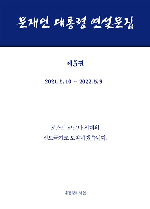 문재인정부의 다섯 번째이자 마지막 연설문집인 '문재인 대통령 연설문집 제5권'이 출간되었다. 2021년 5월 10일부터 2022년 5월 9일까지 1년간 대통령과 국민이 함께 켜켜이 쌓아온 성취와 노력의 시간이 기록되어 있다.