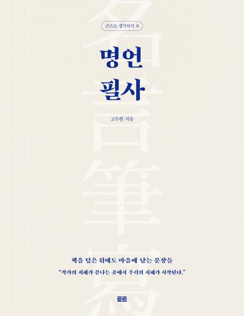 명언은 대부분 짧고 명료하다. 그래서 금방 의미가 전해진다. 그러나 앞뒤 맥락을 알아야 뜻이 오롯하게 살아나는 명언도 많다. 『명언 필사』는 인생의 등대로 삼을 만한 의미심장한 명언뿐만 아니라 그 명언이 세상에 나오게 된 배경과 이야기까지 담고 있어 옮겨 적는 그 뜻이 더욱 깊다. 이 책은 시인 특유의 섬세한 감수성을 느낄 수 있는 에세이에 더해 조심스럽게 고른 특별한 문장들을 곱씹으며 필사의 시간을 가질 수 있도록 구성되어 있다. 국내 서점가에 필사 열풍을 불러일으킨 ‘손으로 생각하기’ 시리즈의 첫 책으로 아직도 꾸준히 사랑받고 있는 『마음필사』의 주인공 고두현 시인의 감성필사에 다시 한 번 동참할 수 있는 기회다.