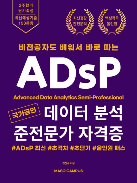 ‘비전공자도 배워서 바로 따는 ADsP’는 한국데이터베이스진흥원에서 실시하는 <데이터 분석 준전문가(ADsP)> 자격증을 준비하는 수험생들을 위한 도서이다. 비전공자는 물론 독학하는 사람도 충분히 자격증을 딸 수 있도록, 그러면서도 단기간에 완성이 가능하도록 하는 것이 본 도서의 목적이다. 쉬우면서도 필수적인 것만 간추린 설명, 단순히 이론 나열만으로는 알 수 없는 시험에 대한 세세한 팁, 이론 외우기와 단답형 대비를 한 번에 할 수 있는 문제를 특징으로 하는 본 도서와 함께하면 2주안에 충분히 ADsP 공부를 완성할 수 있을 것이다.