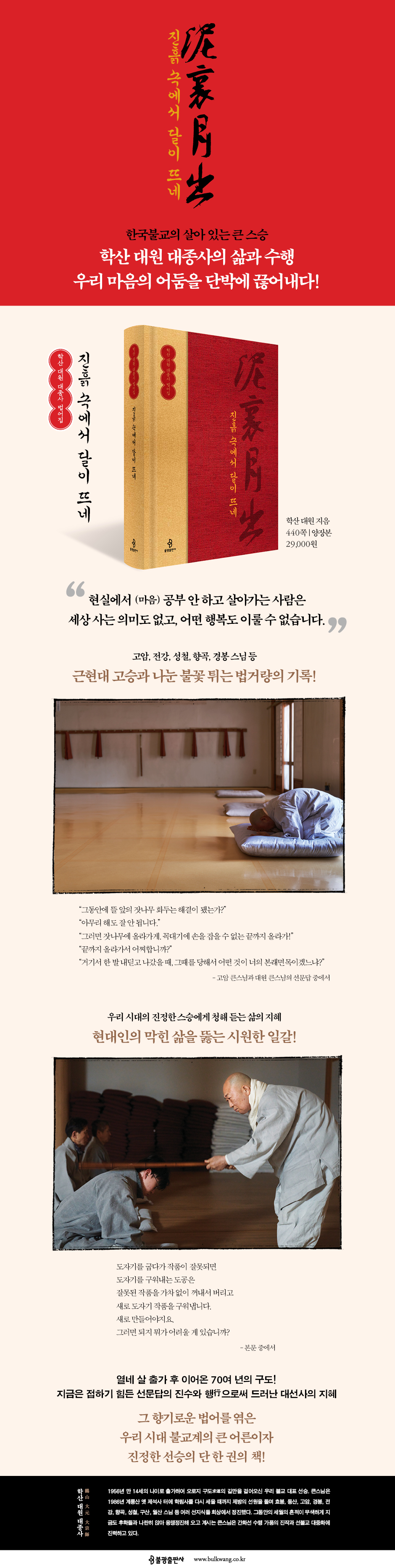 대원 스님은 출가 이후 제방 선원을 돌며 효봉, 동산, 고암, 경봉, 전강, 향곡, 성철, 구산, 월산 스님 등 당대의 내로라하는 선지식을 모시고 수행하며 공부를 점검받았다. 이 책에 담긴 대선사들과 대원 스님이 나누었던 법거량(法擧揚, 스승이 제자의 수행 상태를 점검하기 위해 주고받는 문답)은 요즈음 쉽게 접할 수 없는 귀한 자료이기도 하다. 스승과 제자의 불꽃 튀는 선담(禪談)은 마음의 어둠을 단박에 끊어내는 선(禪)의 정수, 그것이다. 이 밖에도 스님의 수행기, 법어, 법문, 대담을 통해 대원 큰스님의 사상과 법향을 조금이나마 느껴볼 수 있다.