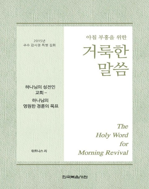 1. 이 책은 믿는 이들이 말씀 안에 계신 주님과 함께하는 아침 부흥 시간을 발전시키고, 2015년 11월 26일부터 11월 29일까지 미국 플로리다 주, 잭슨 빌에서 열린 추수 감사절 특별 집회를 복습할 수 있도록 만들어졌습니다. 말씀 안에 계신 주님을 친밀하게 접촉함으로 믿는 이들은 생명과 진리로 조성되어 그리스도의 몸의 건축을 위해 교회 집회에서 신언할 수 있도록 장비됩니다.