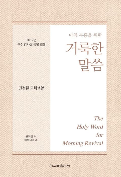 1. 이 책은 믿는 이들이 말씀 안에 계신 주님과 함께하는 매일의 아침 부흥 시간을 발전시키고, 2017년 11월 23일부터 26일까지 미국 애리조나주 피닉스에서 열린 “ 진정한 교회생활”에 관한 추수 감사절 특별 집회 내용을 부분적으로 복습할 수 있도록 만들어졌습니다. 말씀 안에 계신 주님을 친밀하게 접촉함으로 믿는 이들은 생명과 진리로 조성되며, 그리스도의 몸의 건축을 위해 교회 집회에서 신언할 수 있도록 장비됩니다.