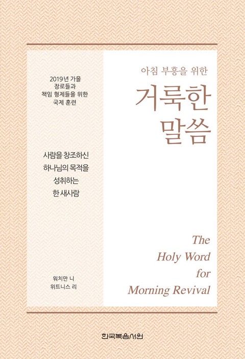 1. 이 책은 믿는 이들이 말씀 안에 계신 주님과 함께하는 매일의 아침 부흥 시간을 발전시키고, 2019년 10월 3일부터 5일까지 인도 벵갈루루에서 열린 “사람을 창조하신 하나님의 목적을 성취하는 한 새사람”에 관한 훈련 집회 내용을 부분적으로 복습할 수 있도록 만들어졌습니다. 말씀 안에 계신 주님을 친밀하게 접촉함으로 믿는 이들은 생명과 진리로 조성되며, 그리스도의 몸의 건축을 위해 교회 집회에서 신언할 수 있도록 장비됩니다.