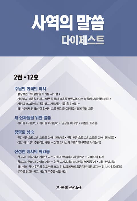 이번 호에서는 《사역의 말씀 다이제스트》 첫 호(1권, 1호)에서 시작한 사역의 네 노선을 연이어 다룰 것입니다. 첫째 노선인 ‘주님의 회복의 역사’는 《위트니스 리 전집》, 1984년, 5권에 있는 〈주님의 회복의 확산을 위한 지침〉의 3장부터 5장까지를 포함합니다. 이 세 장은 이 책의 완결 부분으로서 정상적인 교회생활을 하기를 사모함, 가정에서 복음을 전하고 이주를 통해 확산시킴으로 복음에 대해 열렬해짐, 가정과 소그룹에서 목양하고 가르치는 책임을 짊어짐 등을 다루고 있습니다. 그다음으로 이 노선은 《위트니스 리 전집》, 1991-1992년, 3권에 있는 새로운 책인 〈활력 그룹의 긴급한 필요에 관한 교통〉의 1장으로 이어집니다. 이 장은 하나님께서 정하신 길 안에서 그룹 집회를 실행하는 것에 관한 교통 등을 다루고 있습니다. 둘째 노선인 ‘새 신자들을 위한 말씀’은 《위트니스 리 전집》, 1963년, 3권에 있는 〈생명의 체험을 위한 기본 원칙〉의 11장부터 14장까지로 이어집니다. 이 노선에 있는 장들은 자아와 양심과 세상을 처리함 등을 다루고 있습니다. 셋째 노선인 ‘생명의 성숙’은 《위트니스 리 전집》, 1983년, 1권에 있는 〈내주하시는 그리스도를 주관적으로 체험함〉의 마지막 네 장을 포함합니다. 이 장들은 인간 미덕으로 그리스도를 살아 나타냄, 삼일 하나님의 주관적인 구원, 삼일 하나님의 주관적인 구원을 누리는 법 등을 다루고 있습니다. 넷째 노선인 ‘신성한 계시의 최고봉’은 《위트니스 리 전집》, 1994-1997년, 5권에 있는 〈그리스도께서 아버지에 의해 신성한 영광으로 영광스럽게 되신 결과〉*의 마지막 두 장을 포함합니다. 이 장들은 완결되신 하나님과 거듭난 믿는 이들의 합병체의 세 방면, 아버지의 집과 참포도나무와 새 아이의 기능 등을 다루고 있습니다. 이 노선의 그다음 두 장은 《위트니스 리 전집》, 1991-1992년, 4권에 있는 새로운 책인 〈사람과의 연합 안에서의 하나님의 역사〉로 시작합니다. 이 장들은 영원 과거에서의 하나님의 역사, 시간 안에서의 하나님의 역사 등을 다루고 있습니다.