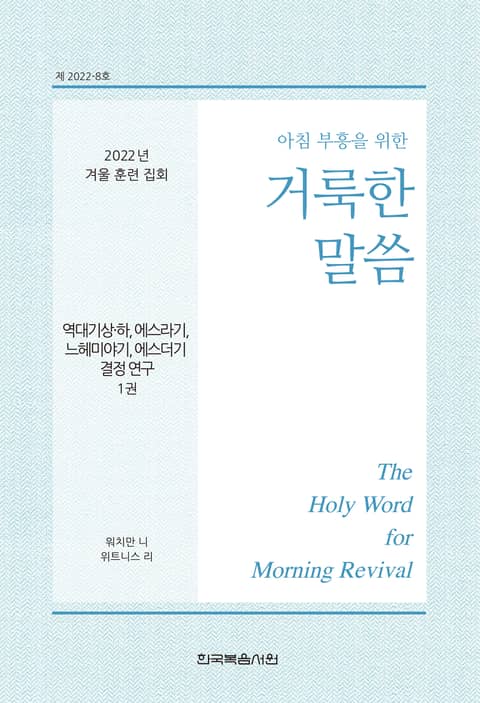 1. 이 책은 믿는 이들이 말씀 안에 계신 주님과 함께하는 매일의 아침 부흥 시간을 발전시키고, 2022년 12월 26일부터 31일까지 미국의 캘리포니아주 애너하임에서 열린 “역대기상·하, 에스라기, 느헤미야기, 에스더기 결정 연구”에 관한 겨울 훈련 집회 내용을 부분적으로 복습할 수 있도록 만들어졌습니다. 말씀 안에 계신 주님을 친밀하게 접촉함으로 믿는 이들은 생명과 진리로 조성되며, 그리스도의 몸의 건축을 위해 교회 집회에서 신언할 수 있도록 장비됩니다.