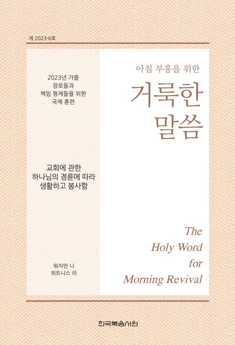 1. 이 책은 믿는 이들이 말씀 안에 계신 주님과 함께하는 매일의 아침 부흥 시간을 발전시키고, 2023년 10월 5일부터 7일까지 필리핀의 마닐라에서 열린 “교회에 관한 하나님의 경륜에 따라 생활하고 봉사함”에 관한 가을 장로들과 책임 형제들을 위한 국제 훈련 내용을 부분적으로 복습할 수 있도록 만들어졌습니다. 말씀 안에 계신 주님을 친밀하게 접촉함으로 믿는 이들은 생명과 진리로 조성되며, 그리스도의 몸의 건축을 위해 교회 집회에서 신언할 수 있도록 장비됩니다.