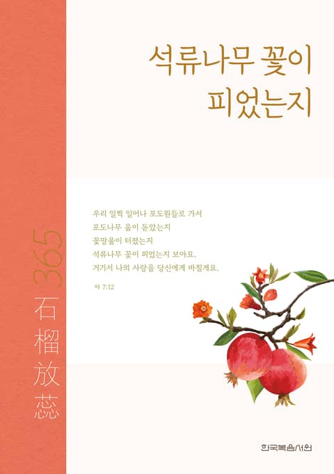 ‘석류나무 꽃이 피었는지’라는 말은 아가 7장 12절에서 나온 것이다. “우리 일찍 일어나 포도원들로 가서 / 포도나무 움이 돋았는지 / 꽃망울이 터졌는지 / 석류나무 꽃이 피었는지 보아요. …” 이 말씀은 술람미가 여러 변화의 단계들을 거쳐 솔로몬의 복사판이 된 후에도 더 전진하여 그의 동역자가 되어 그와 함께 포도원을 돌보아야 한다는 것을 말한다. 이 말씀은 또한 그리스도를 사랑하는 사람은 궁극적으로 포도원인 교회 안에서 주님의 일을 분담하여, 다른 사람들도 싹을 내고 꽃망울을 터뜨리며 꽃을 피울 수 있도록 도와서, 그들을 그리스도 안에서 성숙하게 하여 그리스도의 몸의 건축에 이르게 해야 한다는 것을 의미한다.