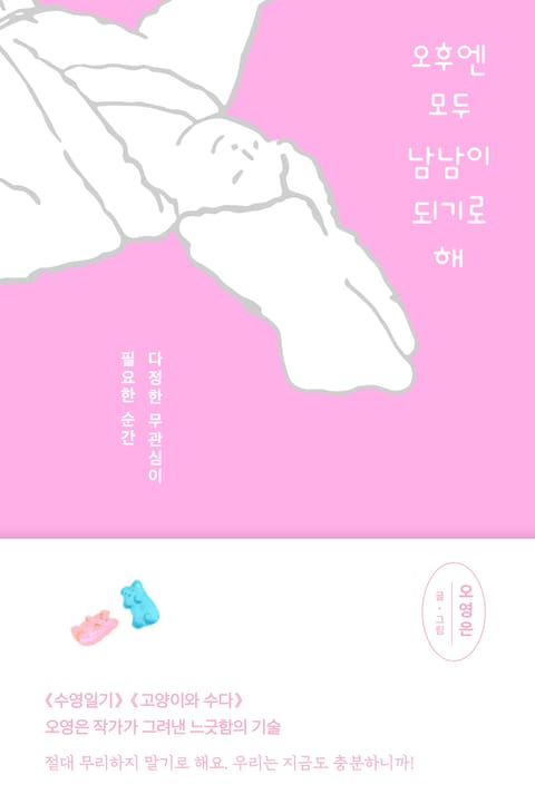 전작을 통해 ‘글과 그림 사이에 여유가 흐르는 작가’란 평을 받은 오영은 작가가 이번에는 ‘오후’를 주제로 세 번째 에세이를 선보입니다. 고양이와 함께한 한낮의 나른한 여유에서부터, 동경하는 작가의 취향에 잠겨 마음이 부드럽게 흔들리던 날, 일러스트레이터로서 겪은 크고 작은 에피소드들 그리고 그에게 빼놓을 수 없는 수영장 이야기··· 마치 아기자기한 사탕 바구니처럼 다채롭고 사랑스러운 이야기가 가득 담긴 책입니다. 작가는 아무 일도 일어나지 않아 오히려 더 좋은 오후의 시간 속에서 문장마다 느긋한 숨결과 따뜻한 온기를 불어넣으며 평범한 하루의 아름다움을 천천히 되새깁니다. 일상 속 사람들의 조용한 웃음과 사소한 대화, 햇살 아래 번지는 둥그런 그림자까지 우리를 미소 짓게 하는 온기가 한 편의 에세이가 된다고 말해줍니다.