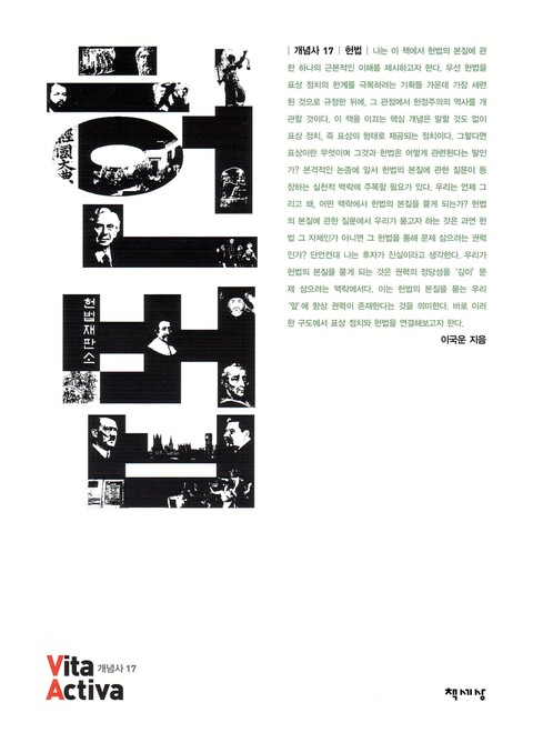 한국 사회와 현대 세계를 이해하는 데 열쇠가 되는 개념들을 뽑아 그 의미와 역사, 실천적 함의를 해설하는 ‘비타 악티바Vita Activa|개념사’ 시리즈의 17번째 권《헌법》은 헌법을 표상 정치의 한계를 극복하려는 기획으로 규정하고, 그 관점에서 헌정주의의 역사를 개관함으로써 헌법의 본질에 관한 근본적인 이해를 제시한다. 이 책이 헌법 개념에 대한 교과서적 이해 대신 헌법 이론의 차원에서 표상이라는 키워드로 헌법을 살펴보는 것은, 우리가 실제로 헌법의 본질을 묻는 실천적 맥락에 대한 성찰에 바탕을 둔 것이다. 저자는 헌법의 본질에 대한 질문은 곧 그 헌법과 관련된 권력의 정당성을 묻는 것이며 시민들을 표상하는 권력을 근원적으로 문제 삼는다는 점에서, 헌법과 표상 정치를 연결하고 있다.