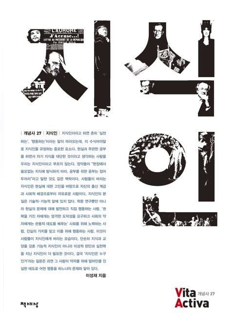 한국 사회와 현대 세계를 이해하는 데 열쇠가 되는 개념들을 뽑아 그 의미와 역사, 실천적 함의를 해설하는 ‘비타 악티바Vita Activa|개념사’ 시리즈의 스물일곱 번째 권《지식인》은 정치권력과 경제권력에 잠식당한 지식인 사회라는 현실에서 다시 ‘지식인이란 누구인가’를 묻는다. 이 질문의 의미는 완벽한 정답을 찾는 데 있는 것이 아니라 그 안에 담긴 문제의식과 함의를 놓지 않는 물음 자체에 있을 것이다. 이 고전적이면서도 첨예한 주제에 답하기 위해 저자는 고대부터 현대까지의 역사 속에서 지식인이 어떤 역할을 해왔으며, 만하임?그람시?사르트르?촘스키?푸코 같은 사상가들은 지식인의 본질과 역할에 대해 어떤 주장을 펼쳤는지, 그리고 대학?언론?자본주의?민주주의와 관련해 지식인이 어떤 쟁점을 형성하고 있는지를 차례로 살펴보며, 마지막으로 오늘날 새롭게 요청되는 지식인상은 무엇인지 고민하고 있다.