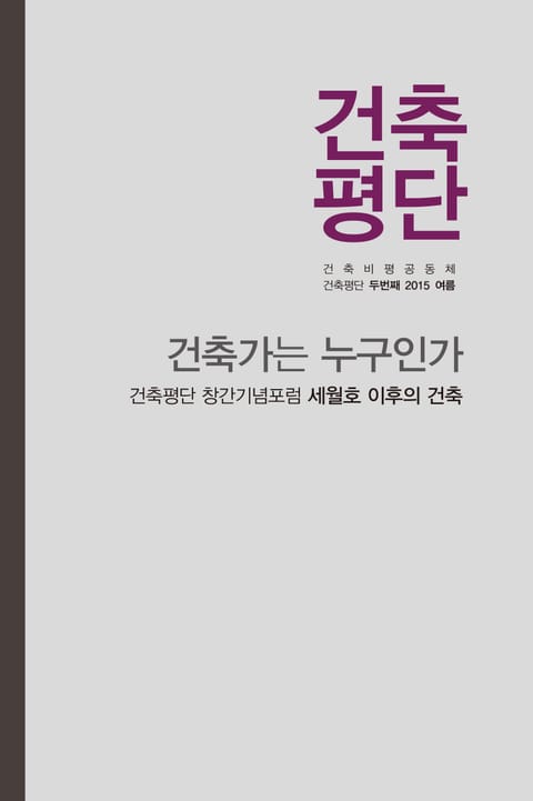 계간 건축평단 2015년 여름호(통권2호)의 전자책. 이번 호의 주제는 ‘건축가’다. 건축가의 정체성에 대해 거의 모든 필자들이, ‘건물을 구상하고, 구상한 것을 물리적으로 구현하는 데 개입하는 자’라는 보편적 인식의 틀을 넘어서고 있다. 또한 건축평단 창간기념포럼 ‘세월호 이후의 건축’의 발제 원고를 수록하였다.