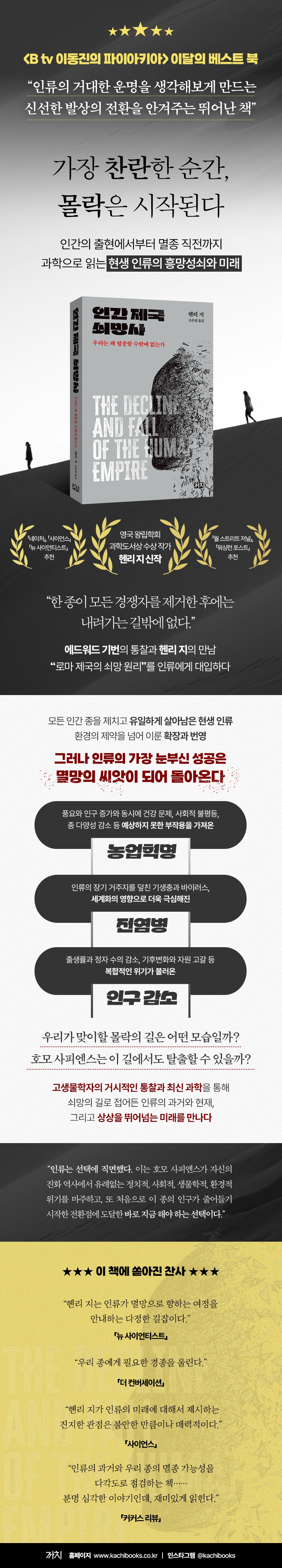 인류는 독보적인 생존 능력과 기술적 창의성을 바탕으로 다른 모든 인간 종을 제치고 유일한 인간 종으로서 지구에서 살아왔다. 농업혁명으로 풍요를 일궈냈고, 녹색혁명, 유전자혁명 등으로 지난 1만 년 동안 인구증가율은 꾸준히 상승세를 유지했다. 그런데 상승 곡선을 그리던 인구는 이제 정체를 지나 감소세로 접어들었고, 기후 위기와 자원 고갈은 우리의 존속 자체를 위협하고 있다. 영국 왕립학회 과학도서상을 수상한 고생물학자 헨리 지는 정점에 오른 생물은 멸종을 피할 수 없다고 말한다. 그에 따르면 인간 역시 예외 없이 지구상의 모든 생명체가 겪어온 운명을 따라갈 뿐이다. 다만 그는 동시에, 환경의 제약을 뛰어넘고 생태적 지위를 무한정으로 확장해온 현생 인류의 성취는 분명 ‘예외적인 것’임을 인정한다. 그렇다면 모든 생물 종의 보편적인 운명과 인류의 특수성이 교차하는 지점에서, 우리가 맞이할 몰락의 길은 어떤 모습일까? 화려한 이력을 가진 호모 사피엔스라면 악화일로로 치닫는 이 길 위에서도 탈출할 수 있을까?