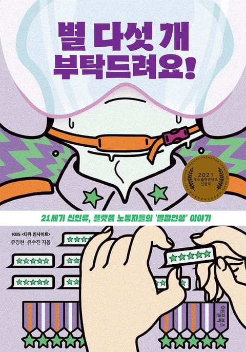 『별 다섯 개 부탁드려요!』는 KBS [다큐 인사이트-별점인생]에서 미처 보여 주지 못한 플랫폼 노동자들의 이야기를 모두 담은 책이다. 저자인 유경현 PD와 유수진 작가는 1년 동안 동행 취재를 통해 플랫폼 노동자들의 고충을 생생하게 기록한 [다큐 인사이트-별점인생]으로 ‘이달의 좋은 프로그램상’과 ‘이달의 PD상’을 동시에 수상하기도 했다. 이 책은 배달, 가사 서비스, 대리 운전, 펫시터, IT 아웃소싱, 강사 등 각각 다른 분야에서 일하는 10명의 플랫폼 노동자들에게 ‘별점 평가’ 제도가 어떤 영향을 미쳤는지 그들의 이야기를 생생하게 담았다.