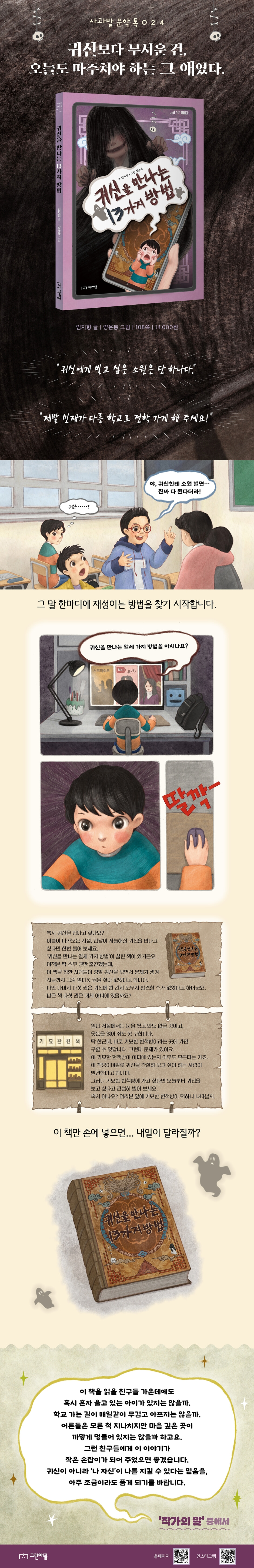 《우리 반 욕 킬러》, 《우리 반 팩폭러》, 《유튜브 스타 금은동》, 〈내일은 슈퍼리치〉, 〈푸하하 달리기 클럽〉등에서 아이들의 말과 관계, 미디어 현실을 교실 이야기로 풀어 온 아동문학 작가 임지형이, 이번에는 “소원을 들어주는 귀신”이라는 흥미로운 설정으로 또래 괴롭힘과 용기의 순간을 포착했다. 《괴담특공대》, 《Voo’s 호러판타지아》 등 공포와 B급 호러 감성으로 사랑받아 온 일러스트레이터 양은봉의 그림이 더해져, 등에 식은땀이 나는 오싹함과 친구 이야기에 빵 터지는 웃음, ‘나도 저랬지’ 하는 진한 공감이 함께 밀려오는 공포 성장 동화가 완성되었다.
