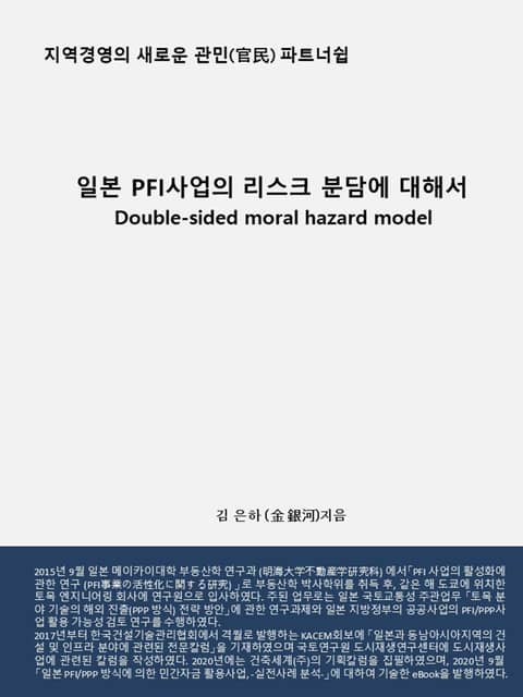 마지막으로 본 책의 3장에서는 PFI사업의 리스크 유형과 특징을 정리한 후, 리스크 분담에 대해서 검토 및 제시하였다. PFI사업은 사업 참여자 양측(관민)의 행동을 관측할 수 없는 사업구조의 특징을 갖는 특성을 바탕으로 관민 최적의 리스크 분담을 검토하기 위해서 “더블 사이드 모럴해저드 (Double-Sided Moral Hazard model) 이론 모델”을 활용하여 적정한 리스크 분담 방법에 관해서 기술하였다. 어떤 사업의 리스크 분담 규칙이라도 퍼스트 베스트를 달성할 수 없으며 어떤 리스크 분담 규칙이라도 사회적 손실은 발생하게 되지만 본 책에서는 이론 모델을 바탕으로 사업 효율성의 관점에서 사회적 최선(퍼스트 베스트)에 가장 가까운 상태의 관민 리스크 분담 규칙을 제안한다.