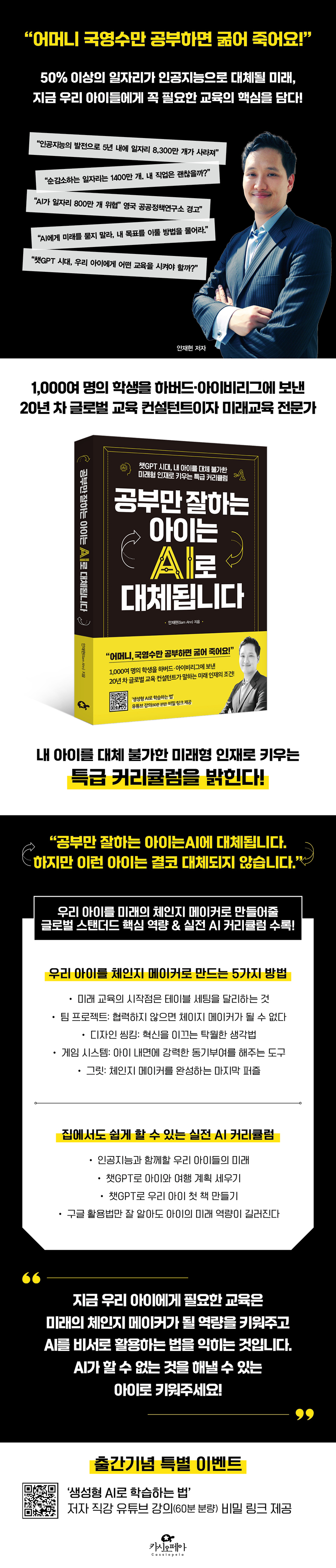 《공부만 잘하는 아이는 AI로 대체됩니다》는 미국 명문대 입시, 미국 명문 보딩 스쿨, 한국과 중국의 교육 시장 등 다양한 스펙트럼의 글로벌 교육 현장을 거친 저자가 그동안 쌓아온 교육자로서의 내공과 자신의 경험담을 바탕으로 우리 아이들에게 진짜 필요한 공부가 무엇인지에 대한 통찰을 들려주는 자녀교육서다. 책의 후반부에서는 대표적인 생성형 AI인 챗GPT를 활용해 가정에서 부모와 아이가 함께 해볼 수 있는 다채로운 AI 커리큘럼도 제시해 실용성을 더했다. 가령, 챗GPT로 아이와 함께 여행 계획 세우기, 챗GPT로 텍스트와 이미지를 생성해 책 만들기 등이 그것이다. 저자의 가이드에 따라 아이와 더불어 챗GPT 이용법을 학습하고 활용하다 보면, 아이에게 좋은 질문을 던지는 능력을 길러줄 뿐만 아니라 부모 역시 새로운 기술에 대한 자신감과 지식을 쌓아올리게 될 것이다. 무분별한 선행 학습 열풍에 회의감이 드는 부모, 우리 아이에게 미래를 살아갈 진정한 실력을 키워주고 싶은 부모들에게 속 시원하고 명쾌한 해법을 제시해줄 미래 교육 필독서다.