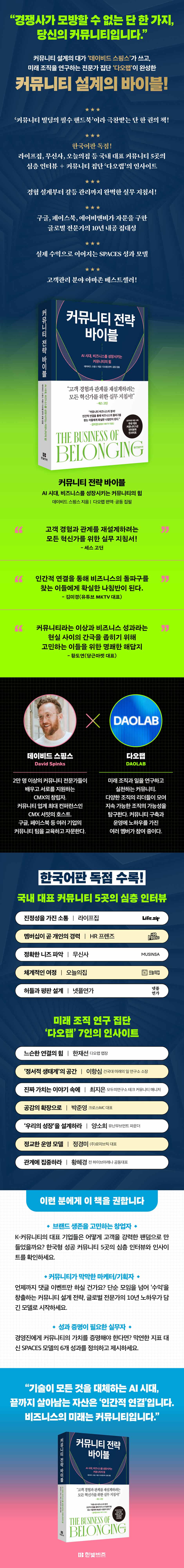 특히 한국어판에는 미래 조직과 일을 연구하는 커뮤니티 ‘다오랩’이 편역과 공동 집필로 참여해 ‘커뮤니티 빌딩 바이블’로서의 완성도를 높였다. 한국어판 독점 수록으로 무신사, 오늘의집, 라이프집 등 국내 대표 커뮤니티 5곳의 심층 인터뷰, 다오랩 멤버들의 인사이트가 추가되어 보다 현실적인 감각을 더해준다. 커뮤니티 구축을 앞둔 마케터, 브랜드 생존을 위해 커뮤니티를 고민하는 창업자, 성과 증명이 필요한 담당자, 커뮤니티 전략을 업그레이드하려는 실무자라면 일독을 권한다.