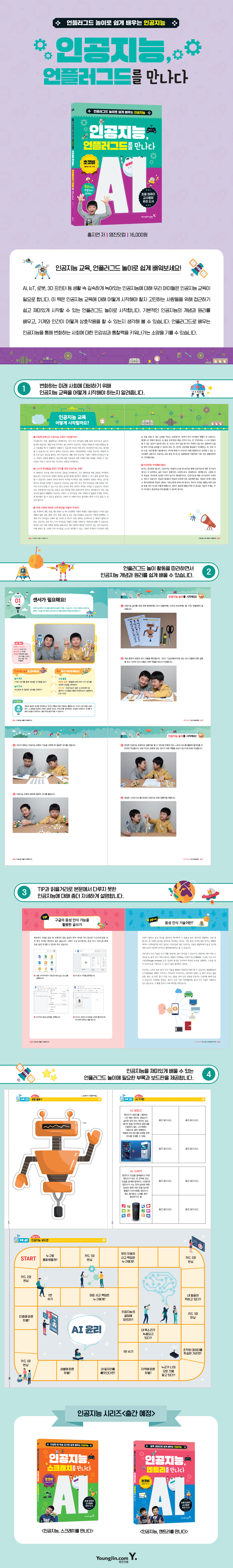 『인공지능, 언플러그드를 만나다』에서 기본적인 인공지능 개념과 원리는 물론 기계와 인간이 어떻게 상호작용하는지 체험하고, 인공지능이 사회에 어떠한 영향을 미치는지에 대해 놀이하는 과정에서 생각해볼 수 있다. 특별한 도구나 교구 없이 책에서 제공하는 부록을 가지고 놀이를 따라 하다 보면 어느새 인공지능에 대해 훨씬 친숙하게 느끼고 학습할 수 있다.