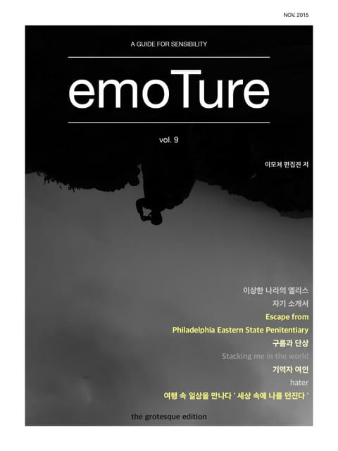 이번 호에서는 그로테스크한 이야기들을 다룹니다. 기괴한 세상 속을 살아가는 이야기들, 기괴하고 낯선 장면들을 담았습니다. 물론 따뜻한 이야기도 잊지 않았습니다. 한국에 남은 편집진과 함께 만들었습니다. 며칠 전, 고향도 아닌 뉴욕을 떠나며 마음 속이 울컥 했습니다. 치밀어 오르는 내면의 무언가가 요동쳤습니다. 저는 기꺼이 그 무언가를 온몸에 담아 다음 여행지로 향했습니다. 용기가 생겼고, 세상 어디든 달려 갈 준비가 되었습니다. 그것은 아마 뉴욕이 저에게 준 선물일 겁니다. 에세이 매거진 <이모쳐>, 이번에는 세상 속에 나를 던집니다.