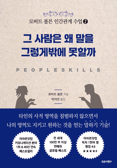1979년 초판, 1986년 개정판 출간 이후 아마존닷컴 커뮤니케이션 분야 1위를 비롯해 40년간 영미권에서 초장기 베스트셀러로 자리매김한 커뮤니케이션 스킬 관련 고전 《People Skills》의 한국어판 번역본이 출간되었다. 한국어판은 ‘인간관계와 듣기 기술’에 관련된《로버트 볼튼 인간관계 수업 ❶》- ‘그 사람은 왜 자꾸 내 말을 끊을까’ 편(10월 출간)에 이어, ‘말하기와 갈등 해결 기술’에 관련된《로버트 볼튼 인간관계 수업 ❷》- ‘그 사람은 왜 말을 그렇게밖에 못할까’ 편이 출간되었다.