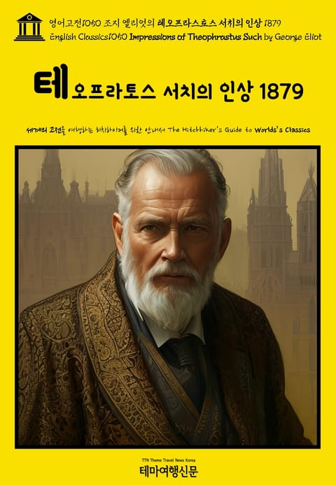 ▶ 테오프라스토스 서치의 인상 1879(Impressions of Theophrastus Such by George Eliot)는 ‘조지 엘리엇 생전에 발표한 마지막 작품’입니다. 테오프라스토스 서치(Theophrastus Such)란 이름의 나레이터가 등장해 18편의 원고를 문학 에세이의 형식으로 묶은 작품으로 조지 엘리엇의 자전적인 목소리와 사회 비판적인 풍자를 구석구석 즐길 수 있는 실험적인 작품입니다. 그녀의 대부분의 작품을 출간한 윌리엄 블랙우드 앤 선(William Blackwood & Sons)에서 1879년 출간하였습니다. 테마여행신문 TTN Korea 영어고전(English Classics)과 함께 어제도, 오늘도, 내일도 멋진 문학여행을! B