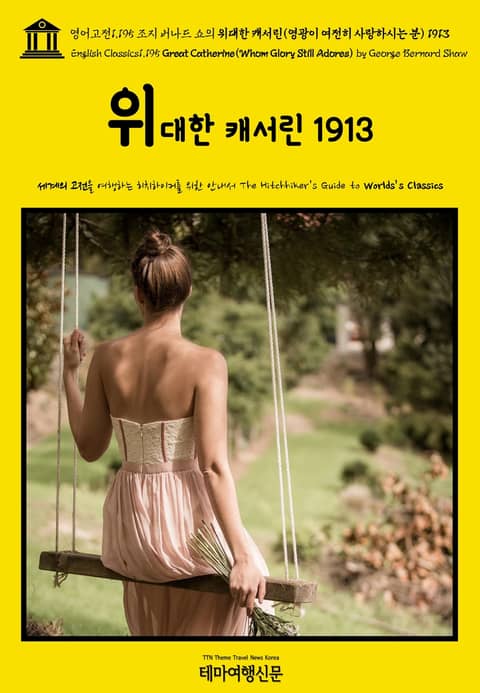 ▶ 위대한 캐서린(영광이 여전히 사랑하시는 분) 1913{Great Catherine(Whom Glory Still Adores) by George Bernard Shaw}는 ‘셰익스피어 이후 최고의 극작가(The Greatest Playwright after Shakespeare)’로 추앙받는 19세기 영국 극작가 조지 버나드 쇼(George Bernard Shaw, 1856~1950)가 풋풋한 청년 시절(1879~1883)을 지나 한층 원숙한 나이(56세)에 집필한 4막(Act 1.~Act 4.)의 희곡(戱曲, Play)입니다. 1913년 런던 웨스트엔드의 보드빌 극장(Vaudeville Theatre)에서 초연을 올렸으며, 제1차 세계대전(World War I, 1914~1918) 중인 1916년 미국 순회공연에 성공하였습니다. 이후 1948년, 1953년, 1968년 TV 드라마 등으로 영상화되는데 성공하였으나, 평론으로부턴 썩 높은 평가를 받지 못했습니다. ▷ 버나드 쇼의 대표작은 단연 희곡(戱曲, Play)일 것이나, 경력 초창기에는 다섯 권의 소설(Five Novels Early in His Career)을 비롯해 정치, 드라마 비평(Politics, Drama Criticism) 등 다양한 분야의 글을 왕성하게 집필한 바 있습니다. 테마여행신문 TTN Korea 영어고전(English Classics) 1,999선과 함께 어제도, 오늘도, 내일도 멋진 문학여행을!