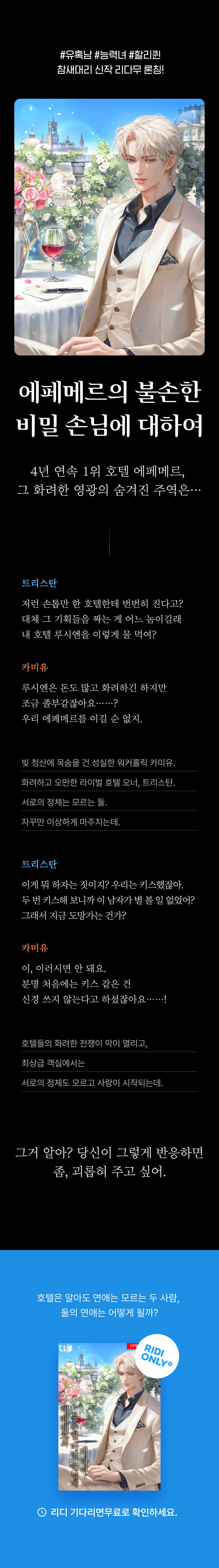 • 설정부터 흥미진진이에요!! 호텔에 대해서만은 호잘알 두 남녀가, 상대방의 신분은 모른 채 얽히고 설키고.. 그렇게 시작된 연애는 어떻게 꾸려나갈지 결과는 어찌될지 지켜보는 재미가 아주 좋습니다! 재미만점 로코에요!