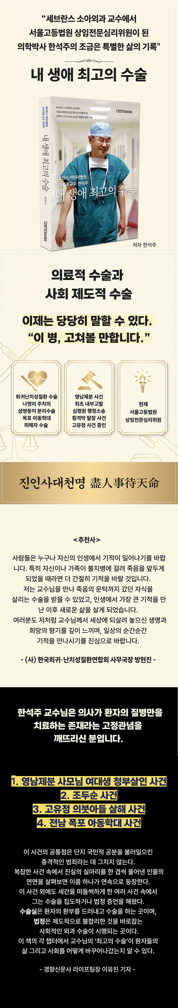 신촌 세브란스 어린이병원 소아외과 교수로 재직하며 수많은 희귀·난치성 질환 환아의 생명을 살려온 의학박사 한석주의 특별한 삶의 기록을 담았다. 퇴임 후 현재 서울고등법원 상임전문심리위원으로 활동하며 의료 소송 심리와 의견서 제출 업무를 수행하고 있다. 소아외과의사로서 나영이 수술, 전남 목포 아동학대 피해자 수술, 샴쌍둥이 분리 수술, 담도폐쇄증 수술, 항문 복원 수술, 심장이소증 환자 수술 등에 참여하게 된 이야기를 소개하고 있다. 또한 의료 사고나 아동 학대 및 살해 사건의 증인으로 나선 일화가 소개되어 있다. 사회적인 수술로는 ‘영남제분 여대생 청부살인 사건’을 일으킨 무기수 윤○○의 근황을 알리기까지 그간 알려지지 않았던 내부고발자로서의 고뇌가 상세히 기록되어 있다. 환자의 편에 서서 심평원과 진료비 삭감 갈등을 해결하는 과정과, 횡격막 탈장사건, 고유정 의붓아들 살해 사건까지 인간 존엄과 사회 정의를 함께 지키고 싶었던 한 외과의사의 용기와 희망을 느낄 수 있을 것이다.