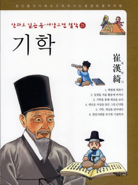 25권 『기학』에서는 최한기의 사상을 재미난 만화로 알아봅니다. 그의 생애와 그가 살았던 시대상을 조명해 보며 그가 어째서 이런 생각을 갖게 되었는지 이해할 수 있습니다. 『기학』은 19세기 조선 한양의 한복판에서 서유럽 자연과학의 연구 업적을 폭넓게 흡수하고 그 과학적 세계관과 동양의 심오한 가치의 세계를 접목하려 했던 그의 시도를 보여주고 있습니다. 또한 자연과학과 사회과학과 인문과학을 통합하며 대 통일장론을 구성한 그의 사유를 엿볼 수 있습니다.