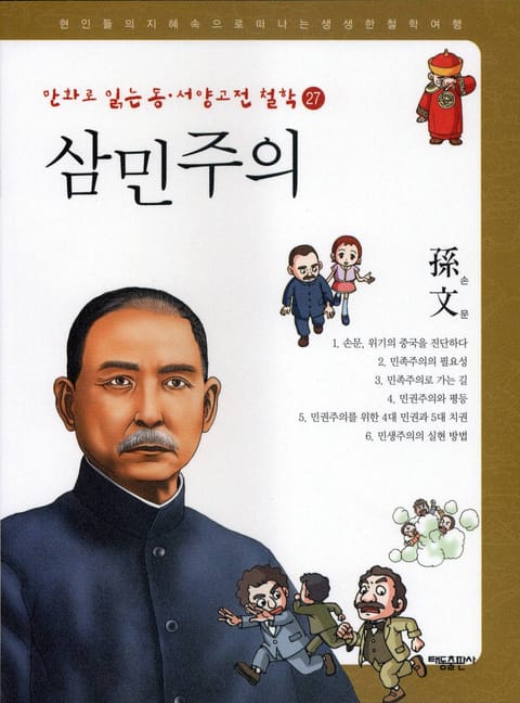 27권 『삼민주의』에서는 손문의 삼민주의를 재미난 만화로 알아봅니다. 삼민주의는 민족주의, 민권주의, 민생주의를 말하며 손문의 정치 사상이자 혁명 이론입니다. 삼민주의는 이후 중국 공산당을 대표하는 모택동과 공화정을 주장한 장계석, 두 갈래로 나뉘어 중국과 대만이라는 서로 다른 국가 체제로 실현되었습니다.