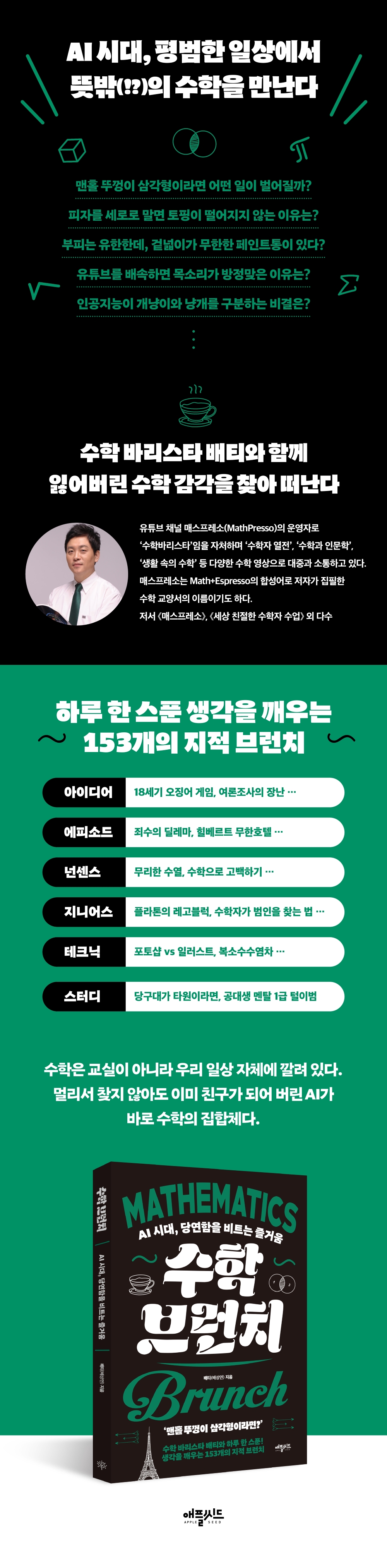 맨홀 뚜껑이 삼각형이라면 어떤 일이 벌어질까? 피자를 세로로 말면 토핑이 떨어지지 않는 이유는? 부피는 유한한데, 겉넓이는 무한한 페인트통이 있다고? 유튜브를 배속하면 목소리가 방정맞게 들리는 이유는? 인공지능이 개냥이, 냥개를 구분하는 비밀은?