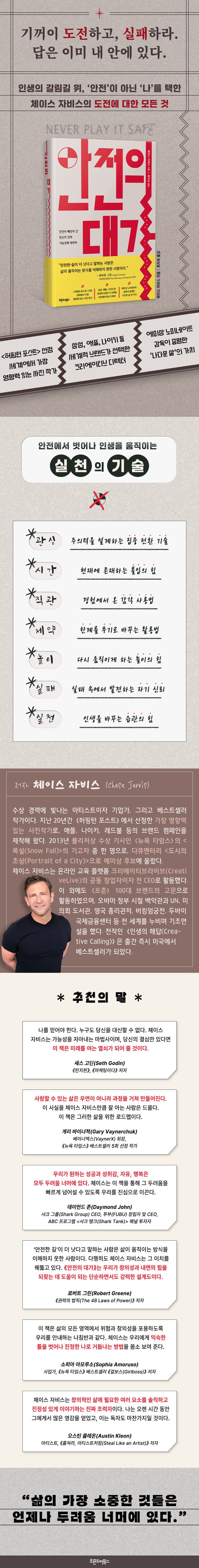 《Never Play It Safe》의 저자 체이스 자비스 역시 어린 시절부터 ‘튀는 사람’으로서 겪은 일을 회고한다. 선생님의 제지와 의대 진학, 프로 축구선수, 스타트업 창업 등 타인의 잣대에 엄격한 자기 검열을 자행하며 방황하던 저자는 문득 ‘나를 막은 것은 세상이 아닌, 언제나 나였다.’라는 깨달음을 얻는다. ‘나다움’이란 때론 ‘선망의 대상’이면서도 동시에 ‘탈선의 상징’이 되기도 한다. 하지만 세상이 정해 놓은 기준에서 벗어나는 삶이 꼭 위험에 자신을 내던지는 것을 의미하지는 않는다. 그 가치의 잣대는 언제나 당신 안에 있다.