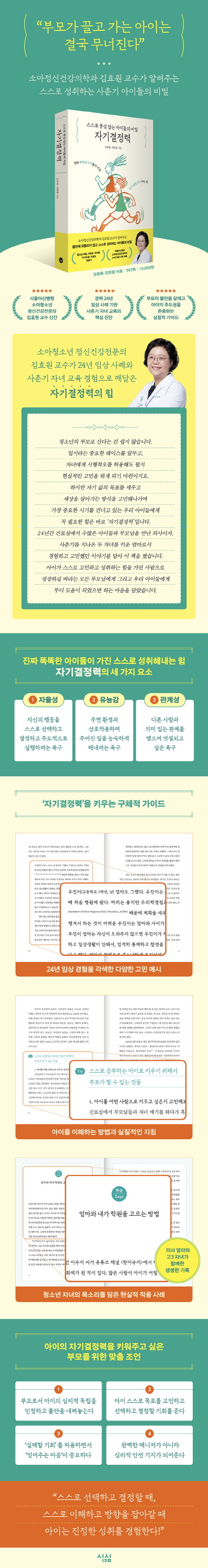베스트셀러에 오른 전작 《아이에게 딱 하나만 가르친다면, 자기조절》이 유초등기 부모들을 위한 양육의 본질을 짚었다면, 이번 신간은 청소년기 자녀를 둔 부모들의 불안을 달래고 나아가야 할 방향을 제안한다. 부모의 불안에서 비롯된 과도한 간섭은 아이의 스트레스와 무력감을 키우는 원인이다. 저자는 24년의 풍부한 임상 경험을 토대로 각색한 다양한 사례를 통해 아이들이 스스로 발휘하는 ‘자기결정력’이야말로 불확실한 시대를 돌파하는 가장 강력한 무기임을 보여준다. 이 책의 특별함은 저자의 전문성에 더해진 당사자성으로, 매 챕터 말미에 저자의 아들 김현웅 군의 목소리를 담은 에세이를 실었다. 집필 당시 고3 학부모이기도 했던 의사 엄마의 양육 원칙이 실제 어떻게 적용되었는지 살펴볼 수 있는 생생한 기록이기도 하다.