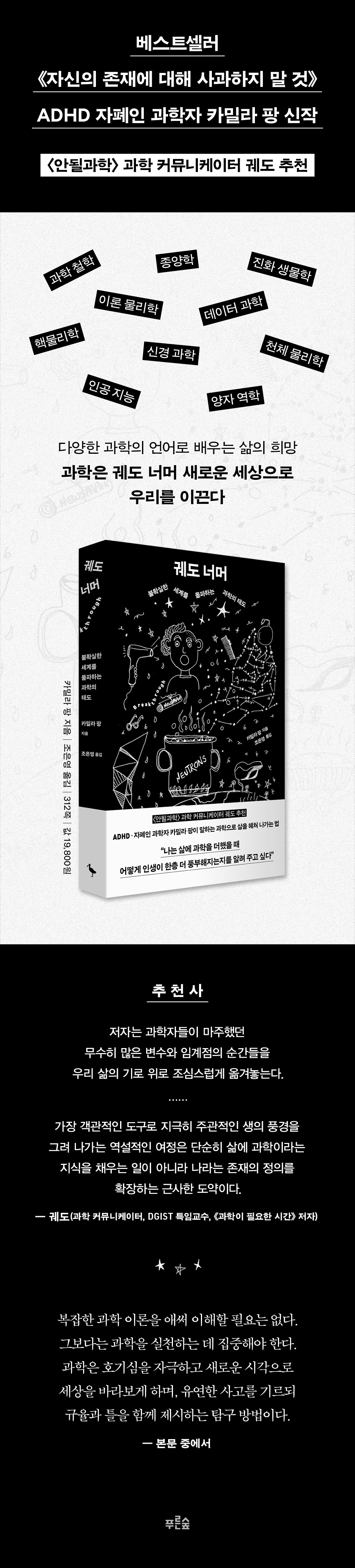 지금까지 삶의 태도를 언급하는 학문은 대개 인문학이었다. 삶을 논하는 것은 인문학의 역할이고, 과학은 삶이 아니라 세상을 객관화하여 측정하는 학문이었다. 팡은 이 경계를 유쾌하게 깨부순다. 과학으로 자신과 세상을 연결한 팡은 과학적 태도와 방법론이 우리가 불확실한 세계에서도 나만의 새로운 삶을 만들어 갈 힘이 되어 준다고 말한다.