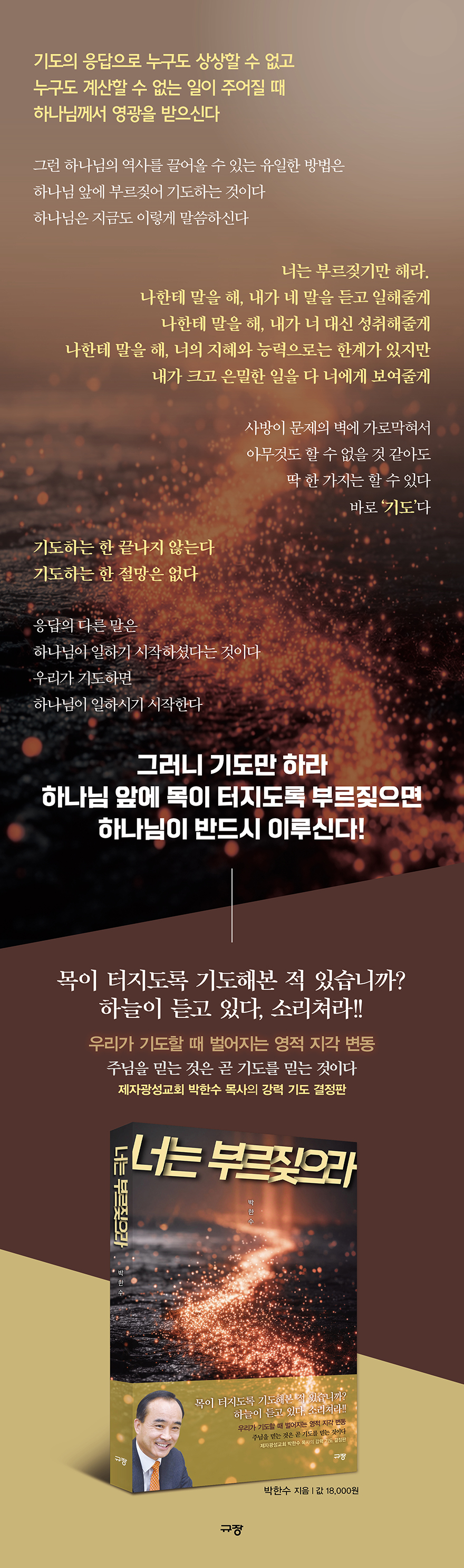 기도는 자신의 숙명이고, 사랑이고, 숙제라고 고백하는 그는 16살 교회 문턱을 넘어 6개월의 종교인의 시간을 지나 주님을 영접한 후 기도와 영원한 벗이 되었다. 교회를 개척한 이후에는 “기도하는 목사보다 기도하게 만드는 목사가 더 위대하다”라는 명분으로 ‘기도’를 외쳐 많은 기도의 사명자들을 일으켰다. 그 사명에 따라 코로나가 한참이던 2022년 12월부터 매주 금요일 ‘너는 부르짖으라’라는 주제로 지금까지 150회 이상 설교했다. 이 책은 바로 ‘너는 부르짖으라’ 시리즈의 결정판이자 기도에 대한 그의 강렬한 열망과 도전을 담고 있다.