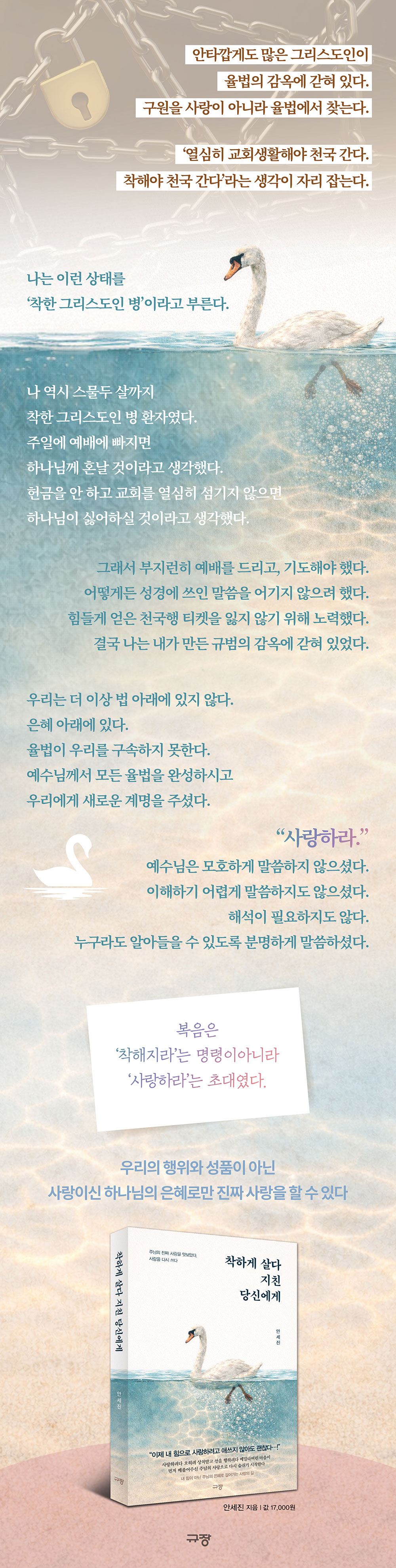 그는 이 책에서 “하나님은 사랑이시라”라는 분명한 복음을 다시 선포하며, ‘착해야 한다’는 의무감에 짓눌려 오히려 사랑을 잃어버린 이들에게 십자가의 은혜에 기대어 하나님과 나와 이웃을 향한 ‘진짜 사랑’을 다시 써내려가자고 초대한다.