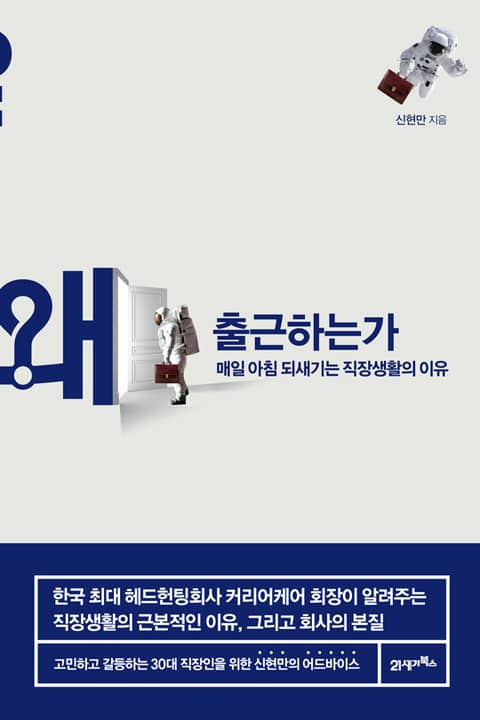 이 책 『왜 출근하는가』(21세기북스)는 직장생활을 하는 근본적인 이유와 회사의 본질에 대한 답을 담은 커리어 조언서로, 30대, 그중에서도 이제 막 사회생활을 시작한 직장 초년생과 직장생활의 의미를 찾기 위해 노력하는 직장인에게 주는 팁이다. 언론인으로서, 경영자로서, 그리고 기업에 핵심 인재를 추천하는 헤드헌팅회사의 대표로서 저자 신현만이 경험하고 느낀 것 가운데 젊은 직장인들에게 꼭 필요하다고 생각되는 내용들을 담았다. 더 정확하게는, 여전히 흔들리고 망설이고 계속 갈 것인지 멈출 것인지를 고민하는 직장인들의 고민에 대한 답이다.
