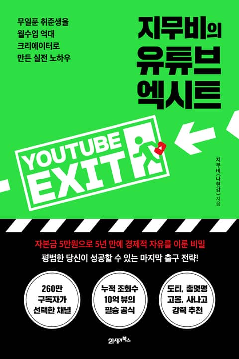 대한민국에서 영화에 조금이라도 관심 있는 사람이라면 유튜브 ‘지무비’ 채널을 알고 있을 것이다. 지무비는 레드오션이라 평가받던 영화 분야에서 단 2년 만에 정상에 오른 유튜버다. 유튜브만으로 억대 월수입을 달성한 성공한 크리에이터이기도 하다. 대한민국 영화 유튜브 1위 크리에이터인 지무비가 자본금 단 24만 원으로 억대 월수입을 이루기까지의 과정과 노하우를 『지무비의 유튜브 엑시트』에서 풀어놓았다.