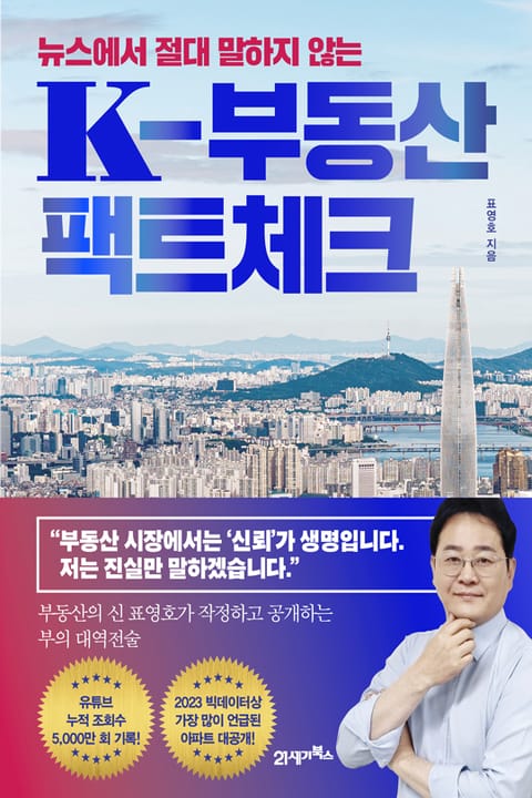 『뉴스에서 절대 말하지 않는 K-부동산 팩트체크』는 한국 부동산 시장을 가장 현실적으로 조명하고 있는 대한민국 대표 부동산 팩트체커 표영호가 정보의 옳고 그름을 판단하기 힘든 개인투자자를 위해 단 한 권으로 정리한 부동산 투자 바이블이다. 자극적인 타이틀 속에 숨어 있는 시장의 진짜 흐름을 파악하지 못하는 초보투자자에게 왜곡된 시장의 진실을 공개하고 보석 같은 투자 찬스를 혼자서도 깨달을 수 있게 돕는다.
