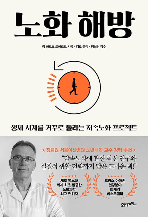 세포 역노화 과정을 세계 최초로 입증한 노화과학 최고 권위자 장 마르크 르메트르의 책이 21세기북스에서 출간되었다. 이 책은 노화의 메커니즘을 분석하여 건강하게 나이 드는 법을 다방면으로 제시한다. 최신 연구가 입증한 노화에 관한 새로운 사실들과 장수마을 주민들의 공통적인 특징을 통해 찾아낸 장수의 비밀, 그리고 노화의 속도를 늦추는 구체적인 생활 습관까지, 천천히 건강하게 늙고 싶어 하는 사람들이 알아야 할 모든 것을 담아냈다. 추천사를 쓴 정희원 서울아산병원 노년내과 교수는 이 책에 대해 “감속노화에 관한 최신 연구와 실질적 생활 전략까지 담은 고마운 책”이라고 표현하기도 했다. 저자는 불로장생의 꿈은 더 이상 허무맹랑한 소리가 아니라고 주장하며, 노화 연구가 지금 어디까지 진행되고 있는지 생생하게 보여준다. 불로장생은 더 이상 미친 과학자의 꿈이 아니다. 노화의 원인을 분명하게 파악한다면, 노화의 시곗바늘이 너무 빠르게 움직이지 않도록 또는 속도를 늦추거나 심지어 바늘의 방향을 거꾸로 돌리는 것도 얼마든지 가능하다고 저자는 말한다.