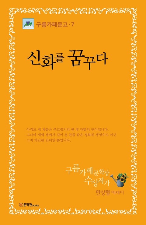 구름카페 문학상 수상작가 한상렬 에세이 『신화를 꿈꾸다』. 수필가 한상렬의 에세이로, 저자 자신의 경험에 비춰 세상을 투영하는 작품들이 수록되어 있다. 깊고 진중한 문체가 인상적이다.